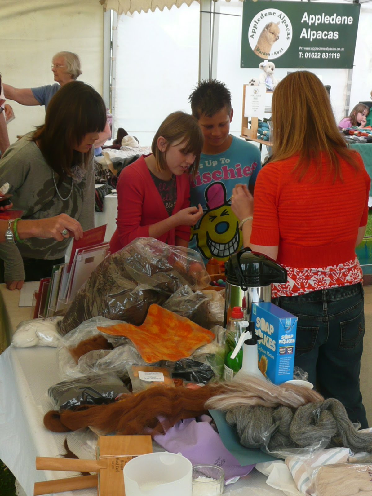 Had a great day on Saturday at the Alpaca Open Day, demonstrating feltmaking with alpaca fleece. It was a really busy day (over 1000 visitors), and there was lots of interest in the animals themselves (including other animals like the cute baby donkey you can see here, with alpacas in the background) as well as all the different things you can do with alpaca fleece, eg spinning, knitting and feltmaking. An interesting change for me as I've never demonstrated all day like this before, but I really enjoyed it and look forward to having another go next year. Thanks to everyone who came along and said hello, and also to all the visitors who collectively raised over £1000 for charity!